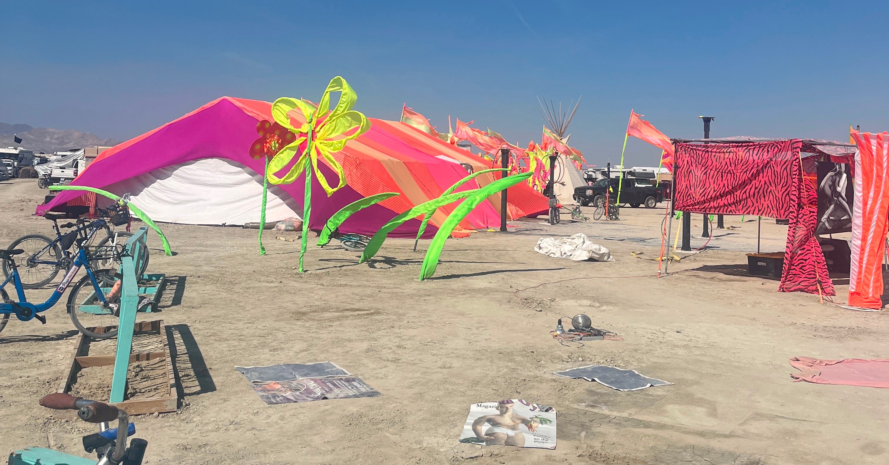 Inside, red fabric draped toward a dim chandelier, mattresses were spaced along the dirt floor as if to the strict regulations of an orgy HOA, and—